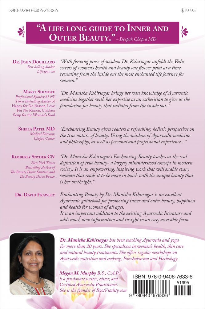 A life long guide to inner and outer beauty. - Deepak Chopra MD Enchanting Beauty by Dr. Manisha Kshirsagar is an excellent Ayurvedic guidebook for promoting inner and outer beauty happiness and health for women of all ages. It is an important addition to the existing Ayurvedic literature and adds much new information and insight in an easy accessible form. - David Frawley Author of The Yoga of Herbs