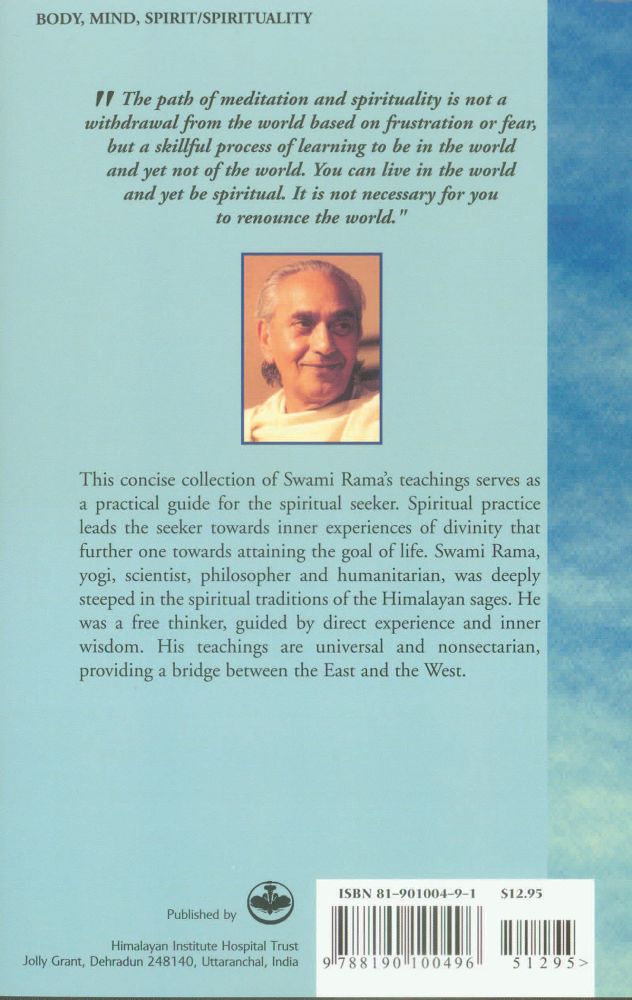 This concise collection of Swami Rama's teachings serves as a practical guide for the spiritual seeker. Spiritual practice leads the seeker towards inner experiences of divinity that further one towards attaining the goal of life. Swami Rama yogi scientist philosopher and humanitarian was deeply steeped in the spiritual traditions of the Himalayan sages. He was a free thinker guided by direct experience and inner wisdom. His teachings are universal and nonsectarian providing a bridge between the East and the West.