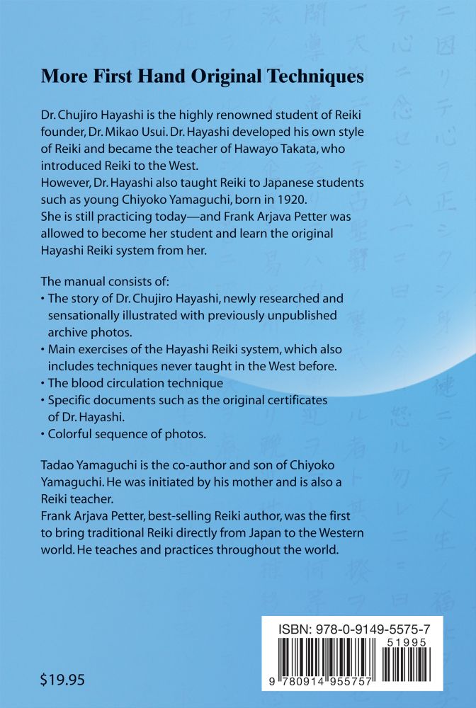 The Hayashi Reiki Manual: Traditional Japanese Healing Techniques from the Founder of the Western Reiki System The manual consists of the story of Dr. Hayashi newly researched and sensationally illustrated with previously unpublished archive photos main exercises of the Hayashi Reiki system which also includes techniques never taught in the West before specific documents such as the original certificates of Dr. Hayashi the main technique of circulation and a colorful sequence of photos.