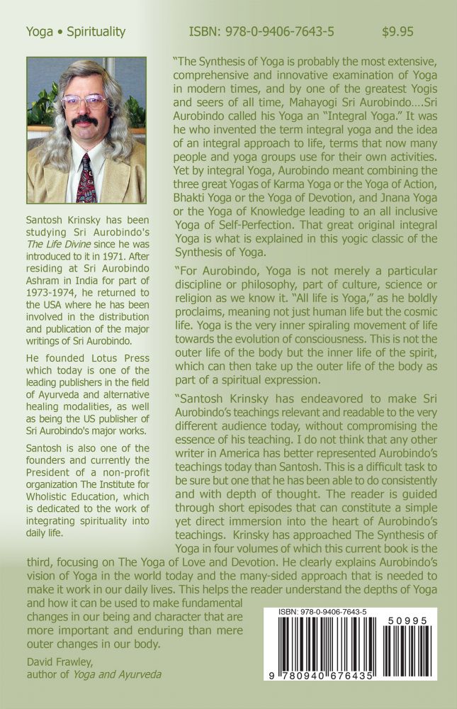 Santosh Krinsky has endeavored to make Sri Aurobindo's teachings relevant and readable to the very different audience today without compromising the essence of his teachings. I do not think that any other writer in American has better represented Aurobindo's teachings today than Santosh. This is a difficult task to be sure but one that he has been able to do consistently and with depth of thought. The reader is guided through short episodes that can constitute a simple yet direct immersion into the heart of Aurobindo's teachings. Krinsky has approached The Synthesis of Yoga in four volumes of which this current book is the third focusing on The Yoga of Divine Love. He clearly explains Aurobindo's vision of Yoga in the world today and the many-sided approach that is needed to make it work in our daily lives. This helps the reader understand the depths of Yoga and how it can be used to make fundamental changes in our being and character that are more important and enduring than mere outer changes in our body.
