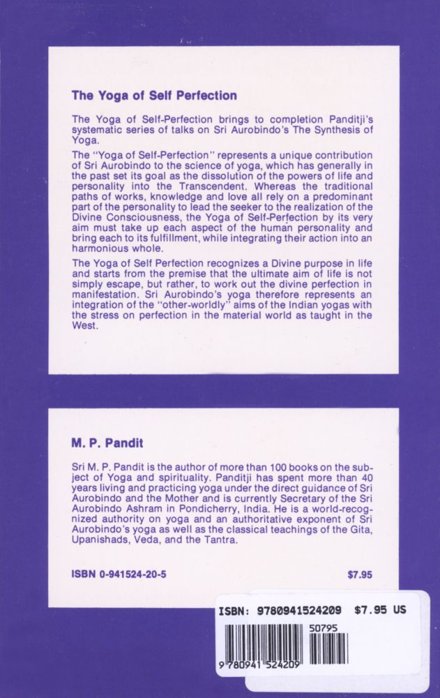 The Yoga of Self-Perfection brings to completion Panditji's systematic series of talks on Sri Aurobindo's The Synthesis of Yoga. The Yoga of Self-Perfection recognizes a Divine purpose in life and starts from the premise that the ultimate aim of life is not simply escape but rather to work out the divine perfection in manifestation.
